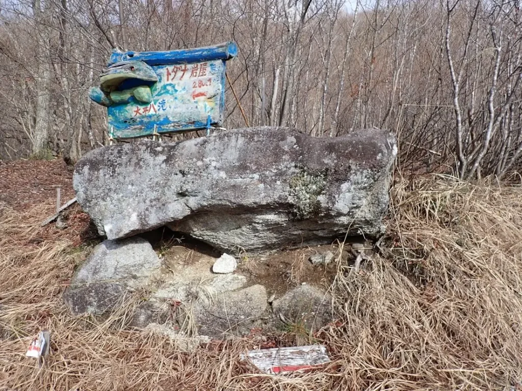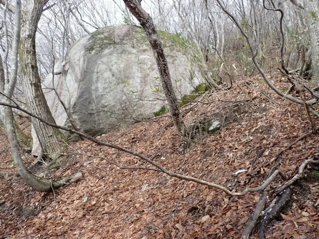 広い急斜面でヤブの薄い所を求め右に左に時に灌木を跨いだ。笹軸に足を取られると滑って見事に転び情けない醜態だった。見覚えのある大石に出逢ってヤレヤレと安堵した。