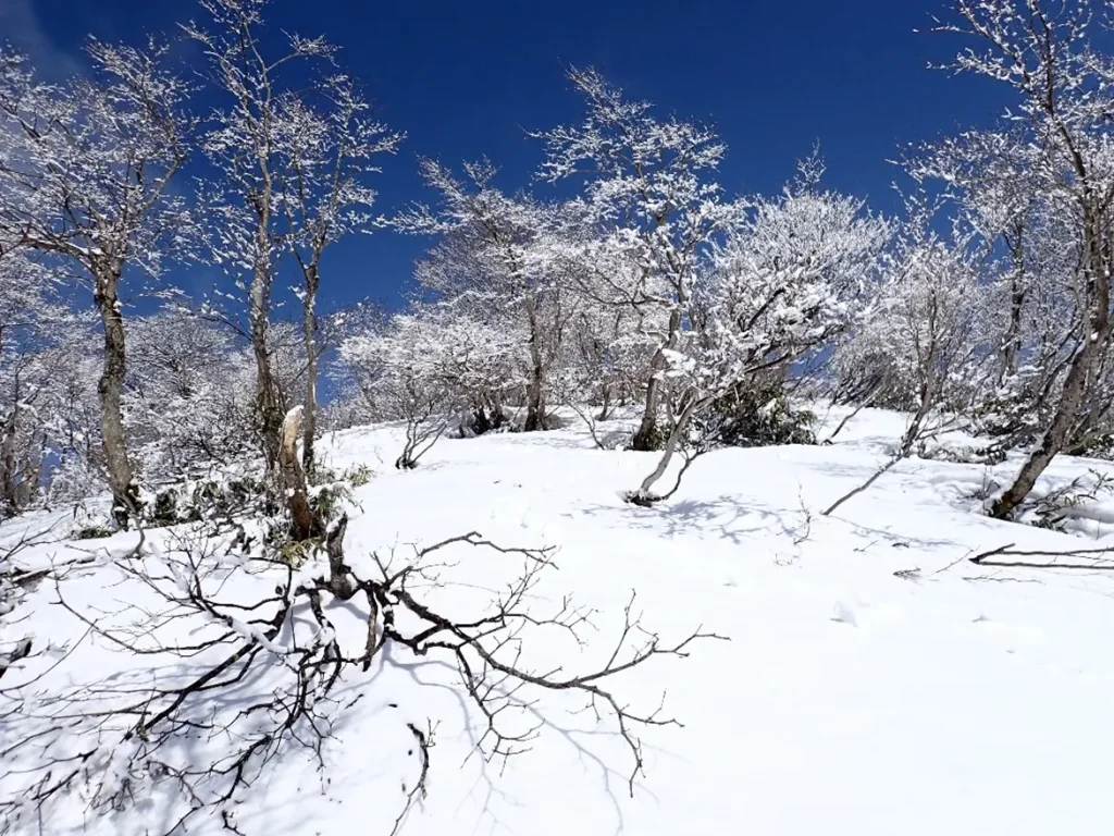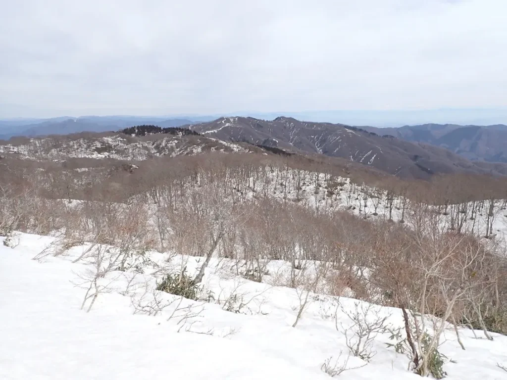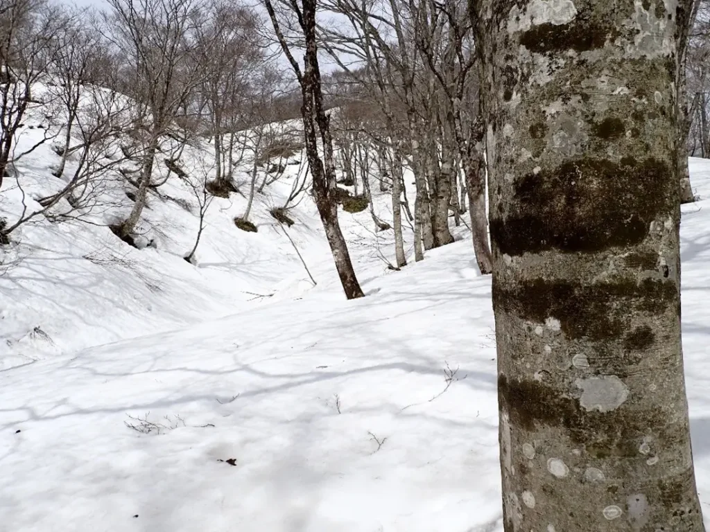 この尾根は北上して1230mで西に向きを変え品又峠から来る県境稜線へ合流して山頂へ至る。先日訪れて勝手知った所、尾根の中腹から谷の浅い所を狙ってトラバースした。時折硬い雪に足を取られたが谷を跨ぐと山頂へ続く尾根に取り付き直登した。