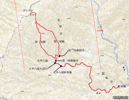 3月20日 駐車地8:25-第二尾根取付9:21-標高1200m台地11:15-ブンゲン山頂11:30-標高1200m 台地11:42(ランチ休憩)-第一尾根下降開始12:32-第一尾根取付(大平八滝入渓口)13:40-駐車地14:34 - 地理院地図2.5万図:横山