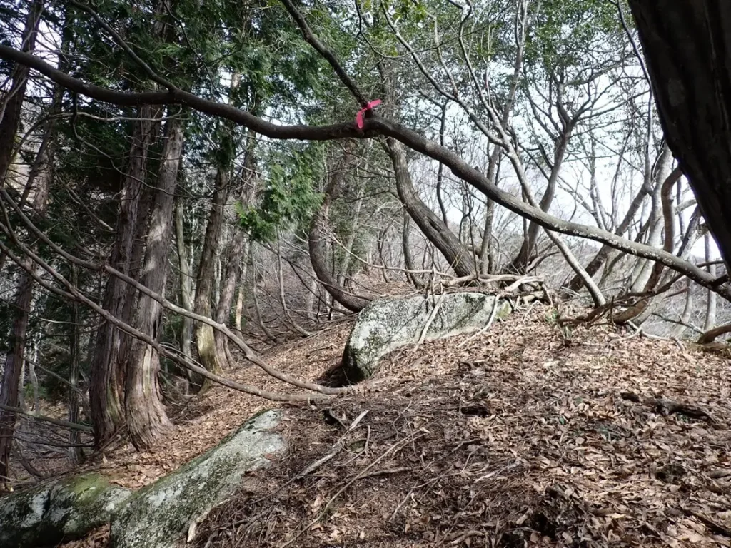 桧の植林帯の尾根に上がりきると山屋のものと思われる目印を見つけた。3月5日の第一尾根では目印を全く見無かったので仲間を得たような気分になった。