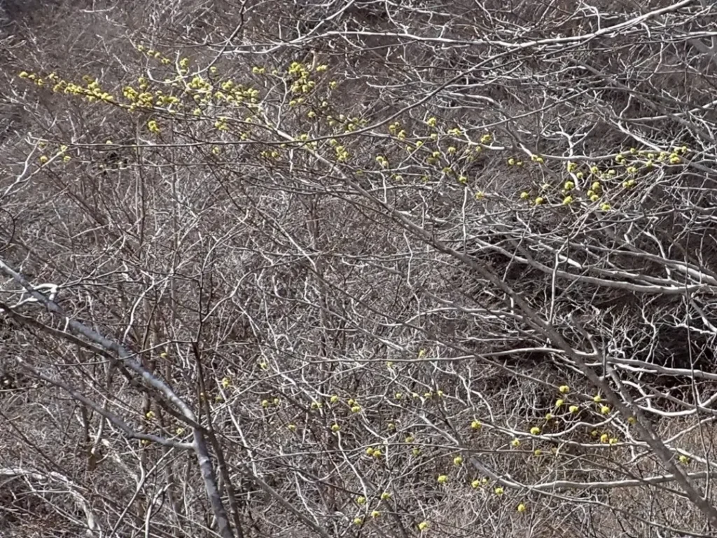 帰りの林道歩行中に開花したアブラチャンを見つけ撮影した。春を発見した気分だった。