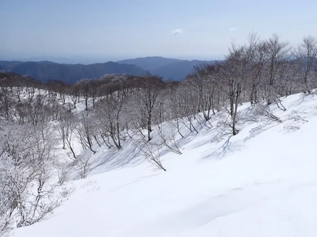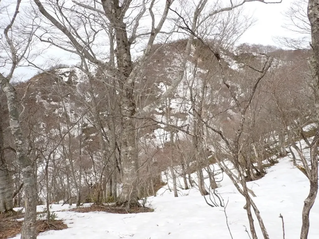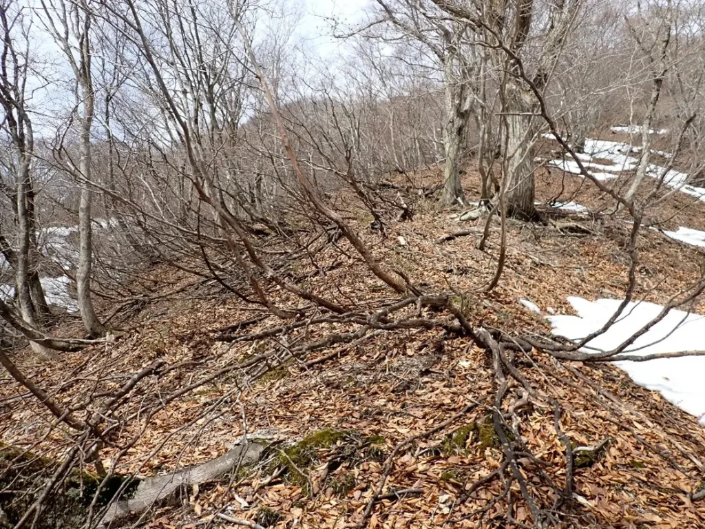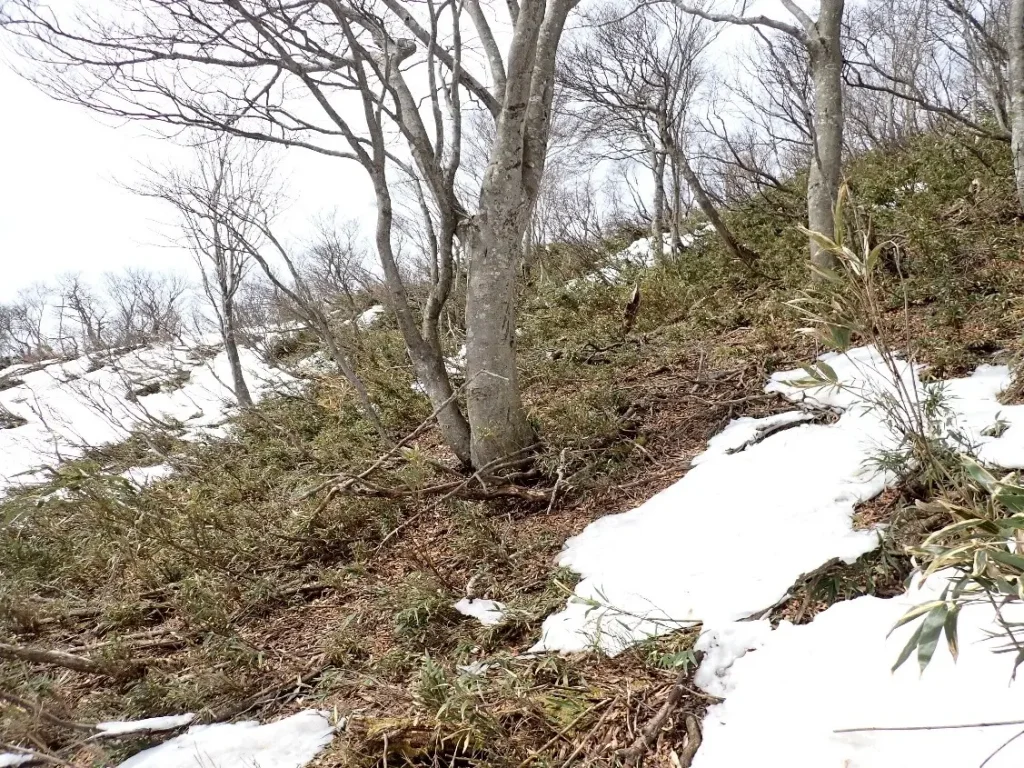 3月5日はこの状態であったが2週間で雪はほとんど消えて笹ヤブが立ち上がっていた。広い急傾斜のヤブ下降はコンパスのみが頼りで進行方向の矢印から目が離せず下降に集中していた。ゆとりが無く写真撮影を忘れ下山後に未熟を感じた。(3月5日撮影)