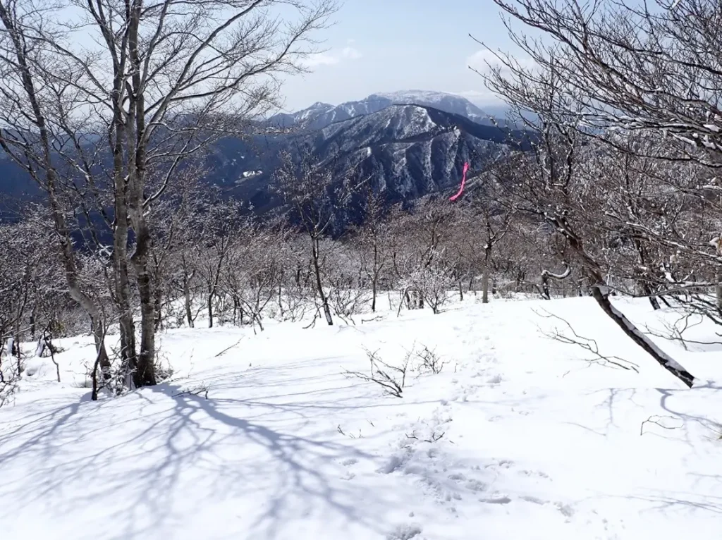標高1200mの台地でランチタイムを終えると第一尾根を下降した。5日はピストンなので赤目印を使用し足跡も当てに出来た。しかし目印は当日下山時に撤去しており20日の様相は写真とはかなりというより全く違っていた。(3月5日撮影)