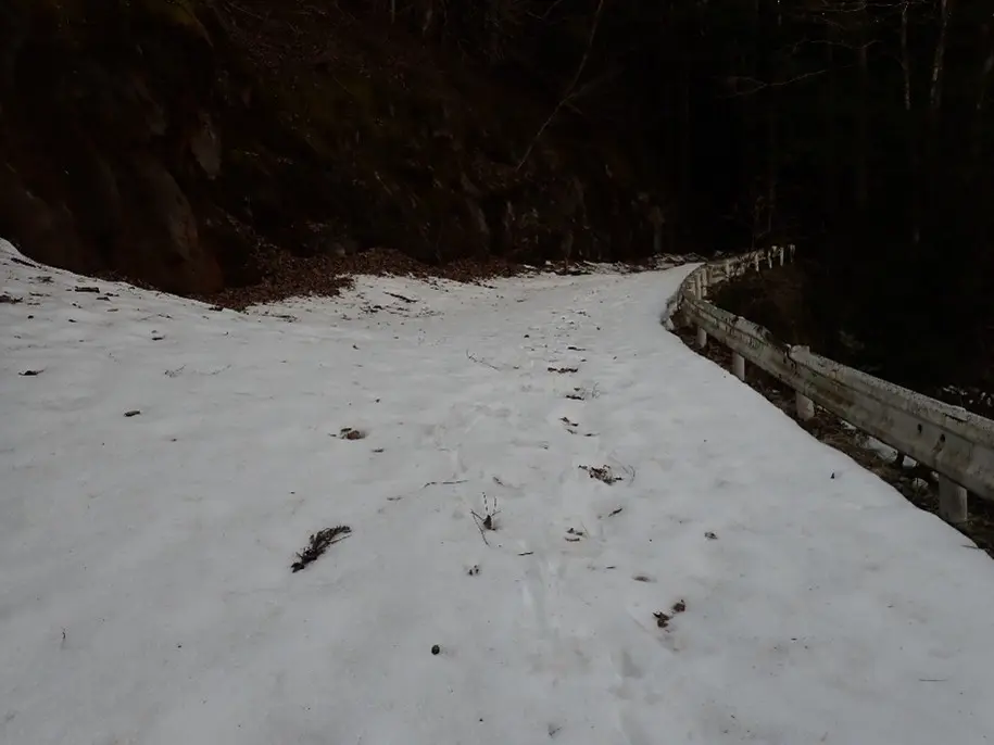 3月5日、この雪に阻まれ東谷と作業小屋を過ぎた所の膨らみで車を残念した。3月20日は融けていると確信していたのだが未だ残っており、この日も林道を50分強歩いた。