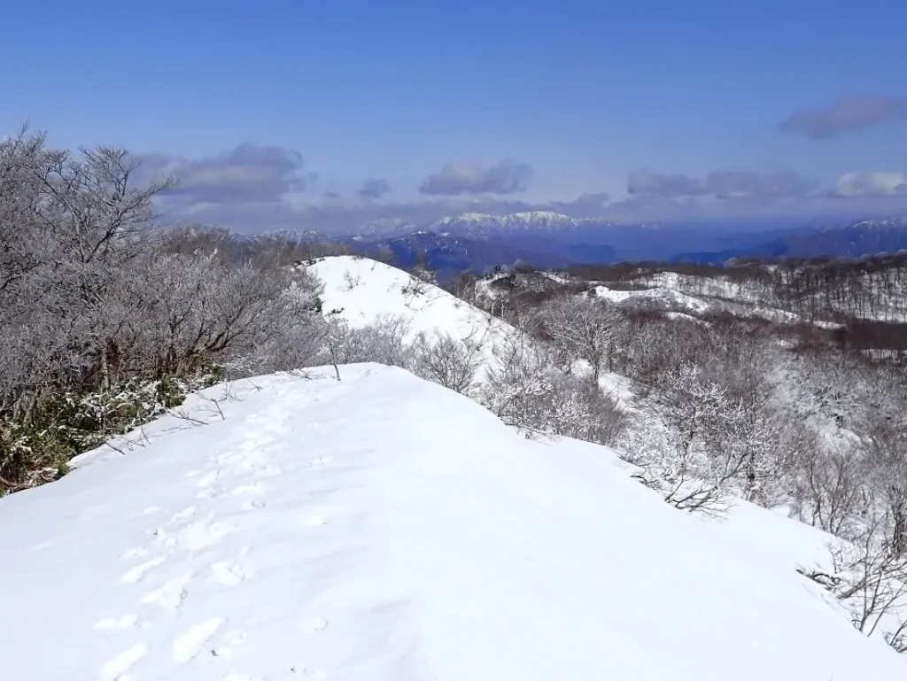 3月5日も20日も山頂で誰にも会うことは無かったがスキー場からと思われる古い踏み跡が両日とも残されていた。ヤブの向こうに金糞岳が見えていた。(3月5日撮影)