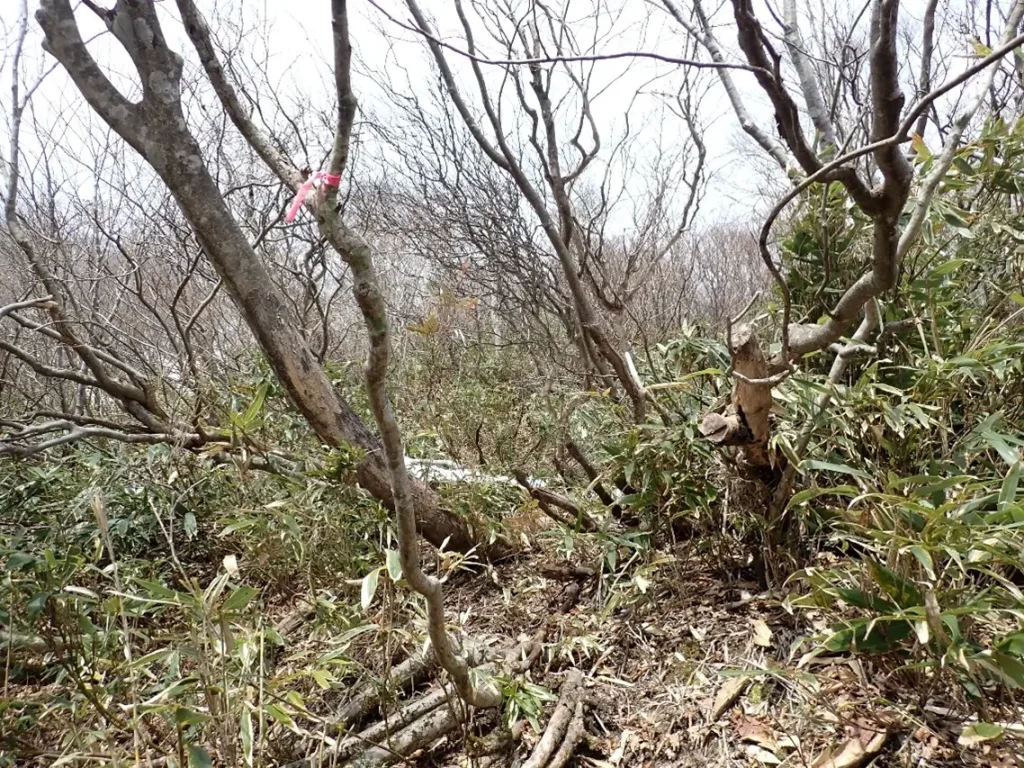 標高1100mから傾斜が強くなるとヤブが立ち上がっており右に左に薄い所を狙う。目印の主だろうか幹や枝に鋸の切断痕を見つけて先人の苦労の跡を偲んだ。
