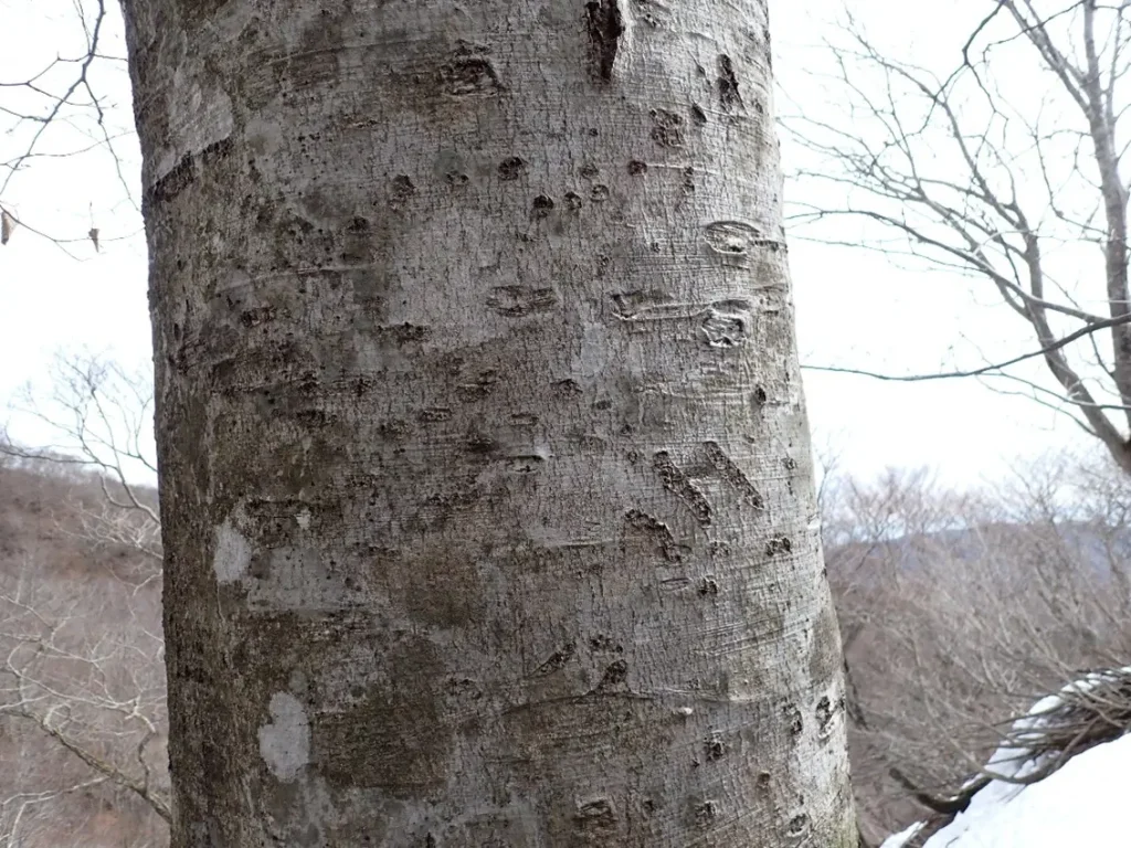 ブナの幹に残されていたクマが上り下りした爪痕、周囲の大半のブナの幹はこのような傷が多く残されていた。