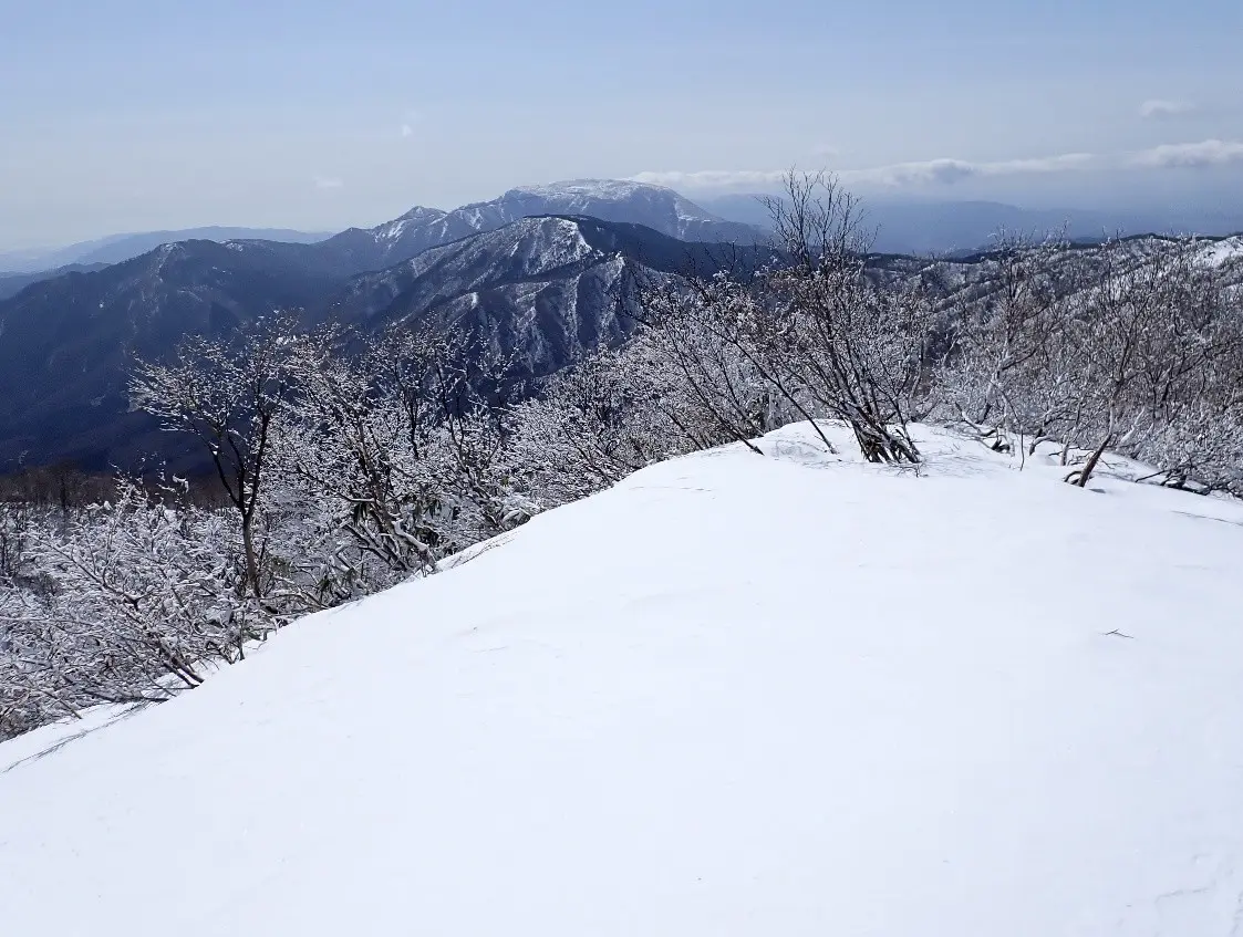 この尾根は北上して1230mで西に向きを変え品又峠から来る県境稜線へ合流して山頂へ至る。先日訪れて勝手知った所、尾根の中腹から谷の浅い所を狙ってトラバースした。時折硬い雪に足を取られたが谷を跨ぐと山頂へ続く尾根に取り付き直登した。