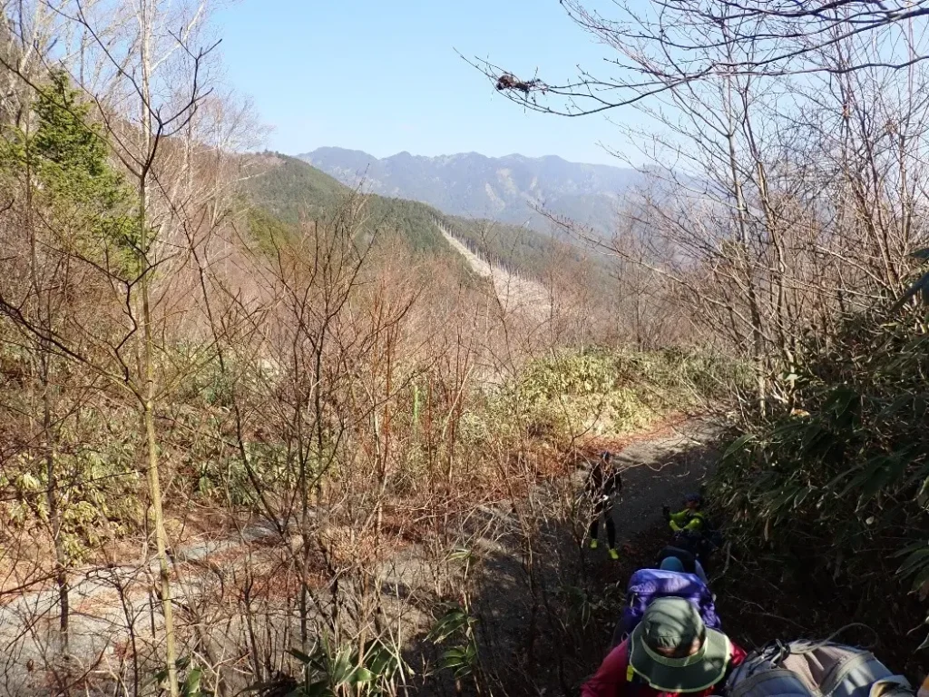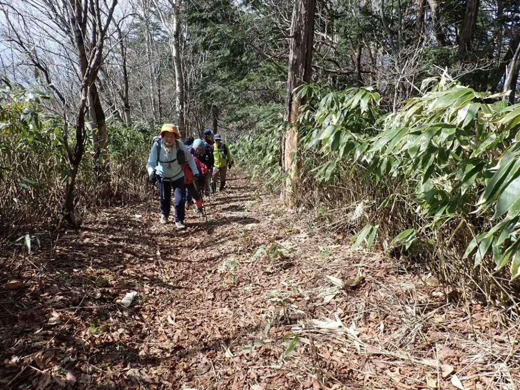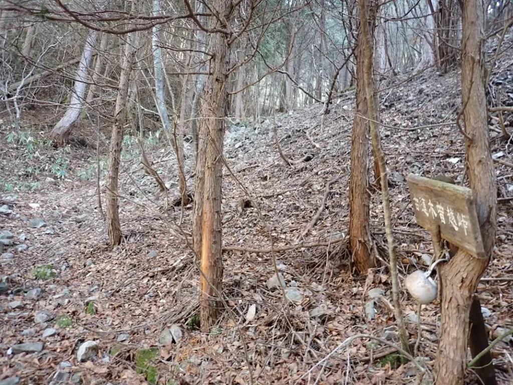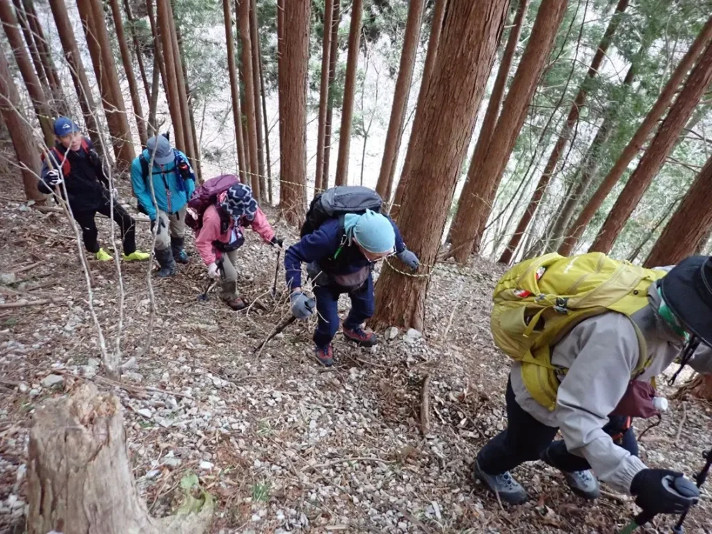 急勾配の杉の植林帯斜面の中につけられた九十九折の道は足元が落ち葉で埋まっており下山時のスリップが心配になる程の急傾斜地でトラロープが張り巡らされていた。