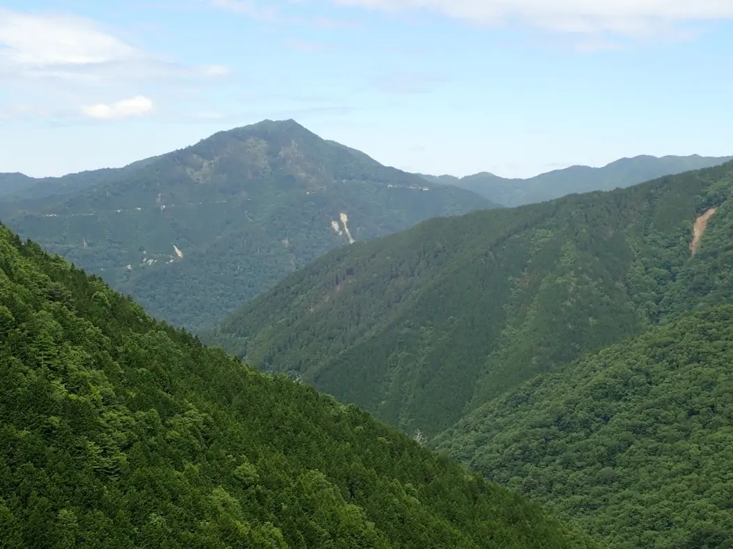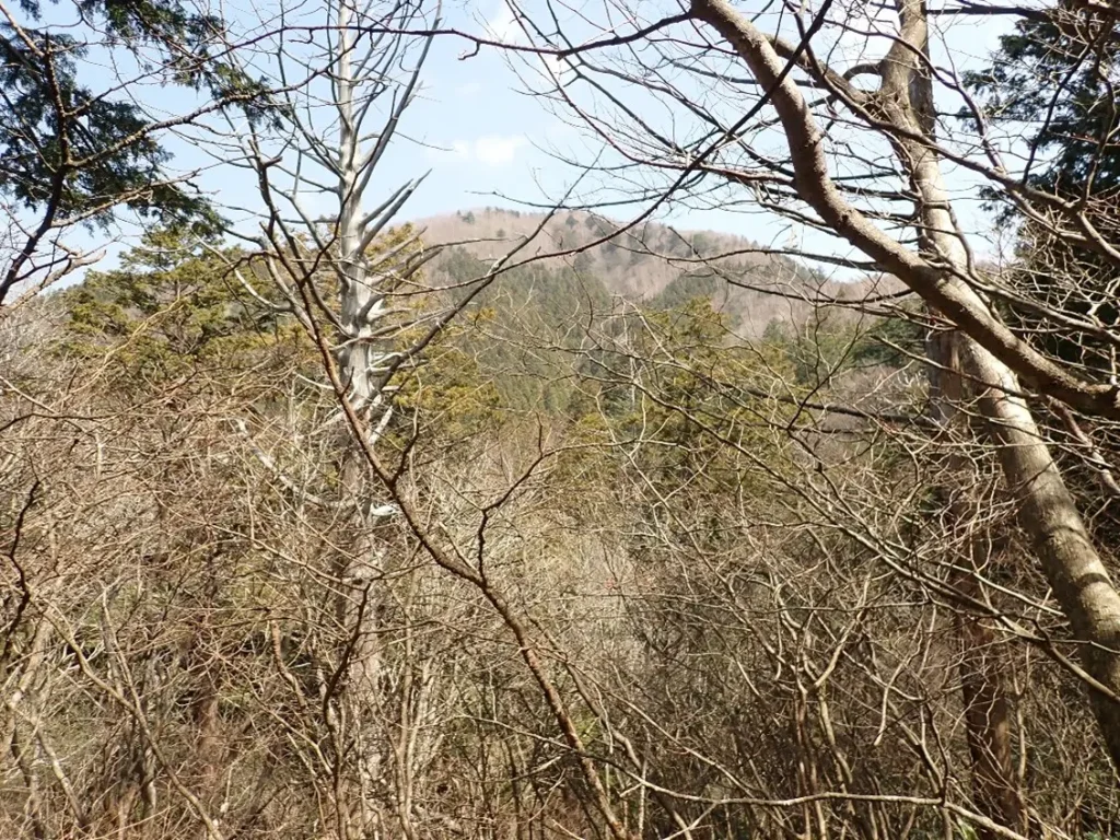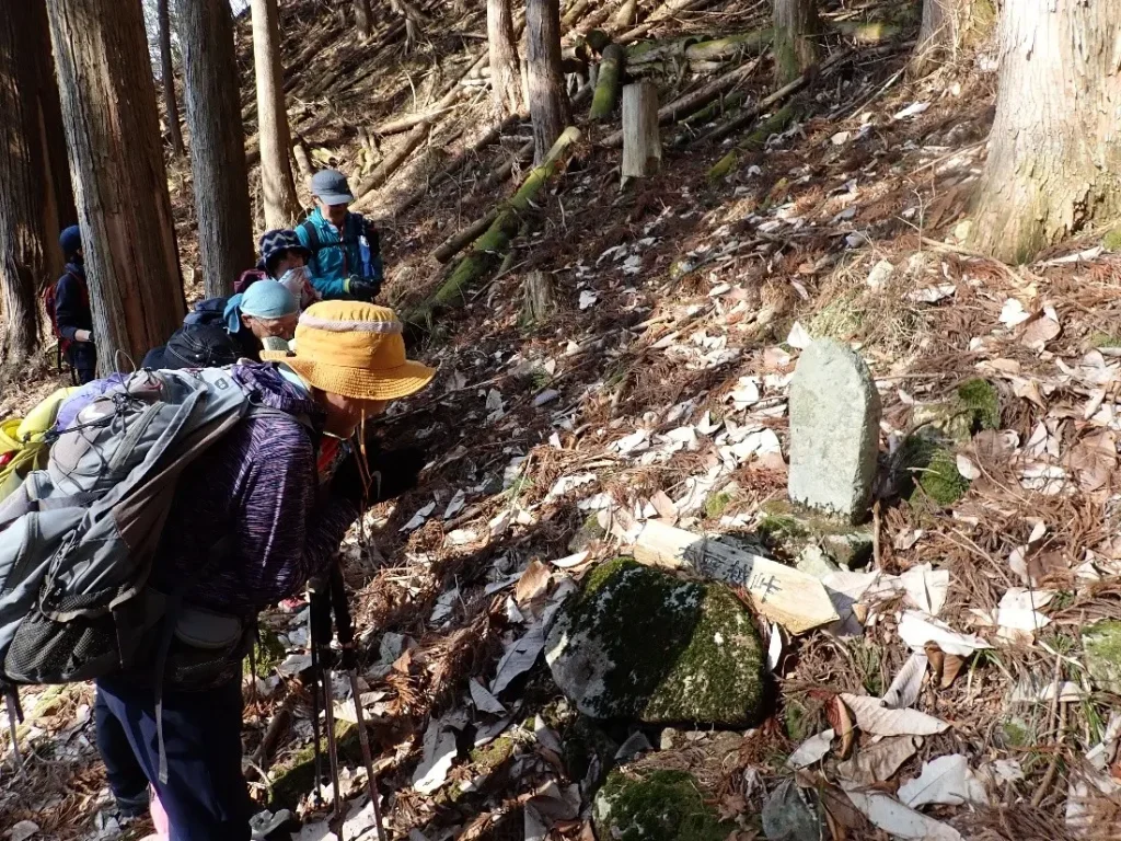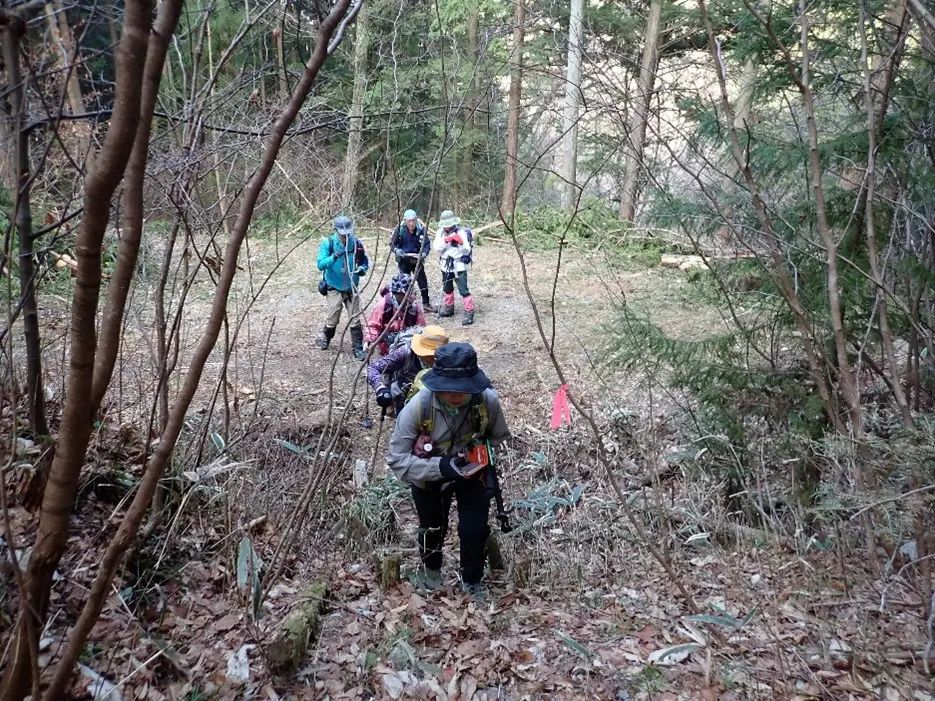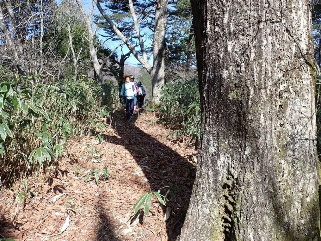 急勾配の杉の植林帯斜面の中につけられた九十九折の道は足元が落ち葉で埋まっており下山時のスリップが心配になる程の急傾斜地でトラロープが張り巡らされていた。