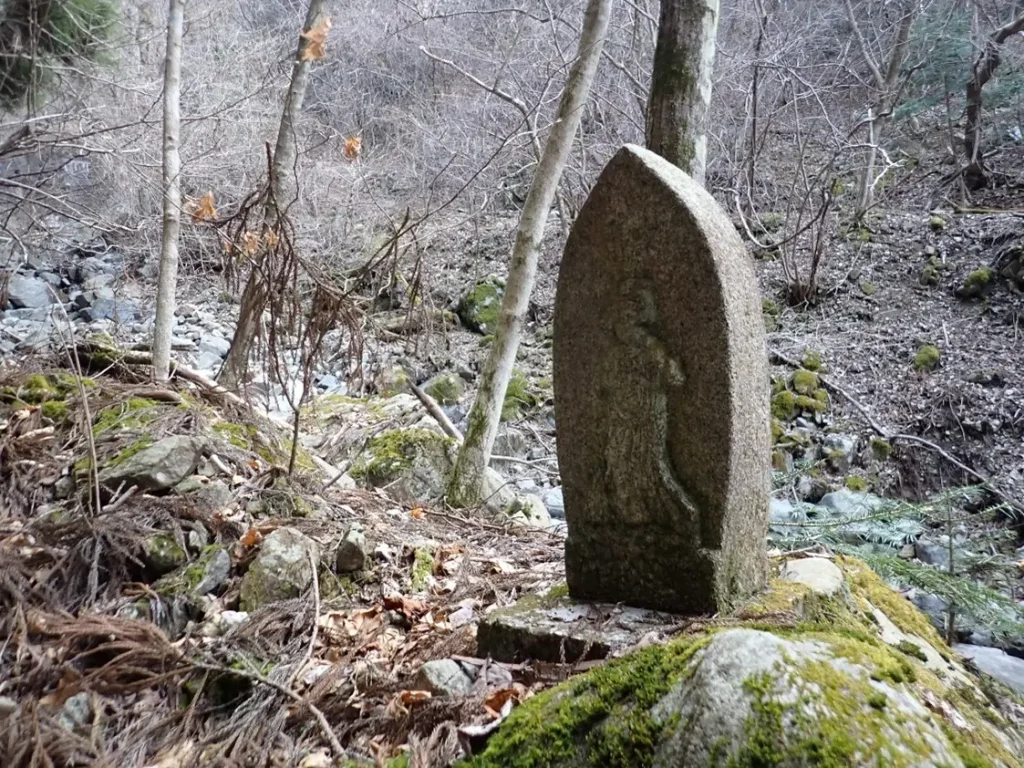 大きな堰堤を左岸から高捲きして越え右岸へ渡った所に三体目の観音像が安置されていた。この後標高1000m辺りから約100mの急登が始まり緊張の登山が続くことになった。