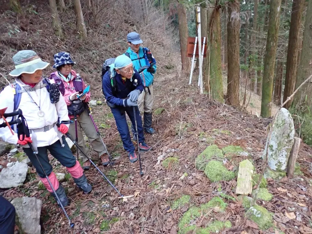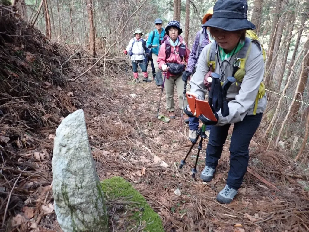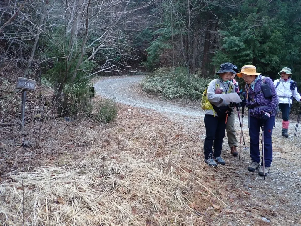 踏み跡が薄く怪しくなった斜面を越すと古道は終わり再び林道へ復帰した。だが直ぐに林道は分岐となった。地形図で進行方向を確認するメンバー達、この頃は言わなくとも新たな分岐では必ずコンパスと地形図で確認する習慣が出来た。この姿を見るのが一番好きだ。