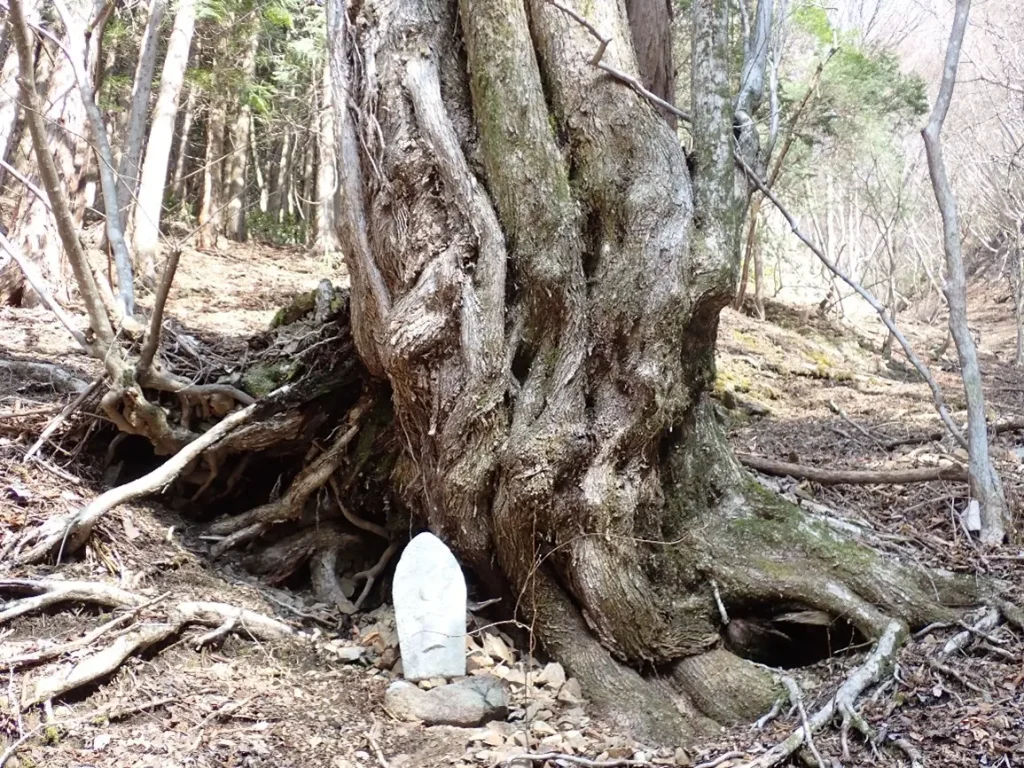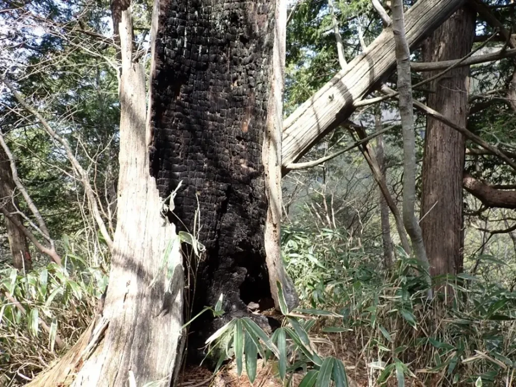 2014年の登山の折りに檜の大木が落雷にやられ虚の内部が黒く焼け焦げているのを見た。当時はもっと落雷の痕が生々しく感じたが12年経った現在まで残っていようとは・・・