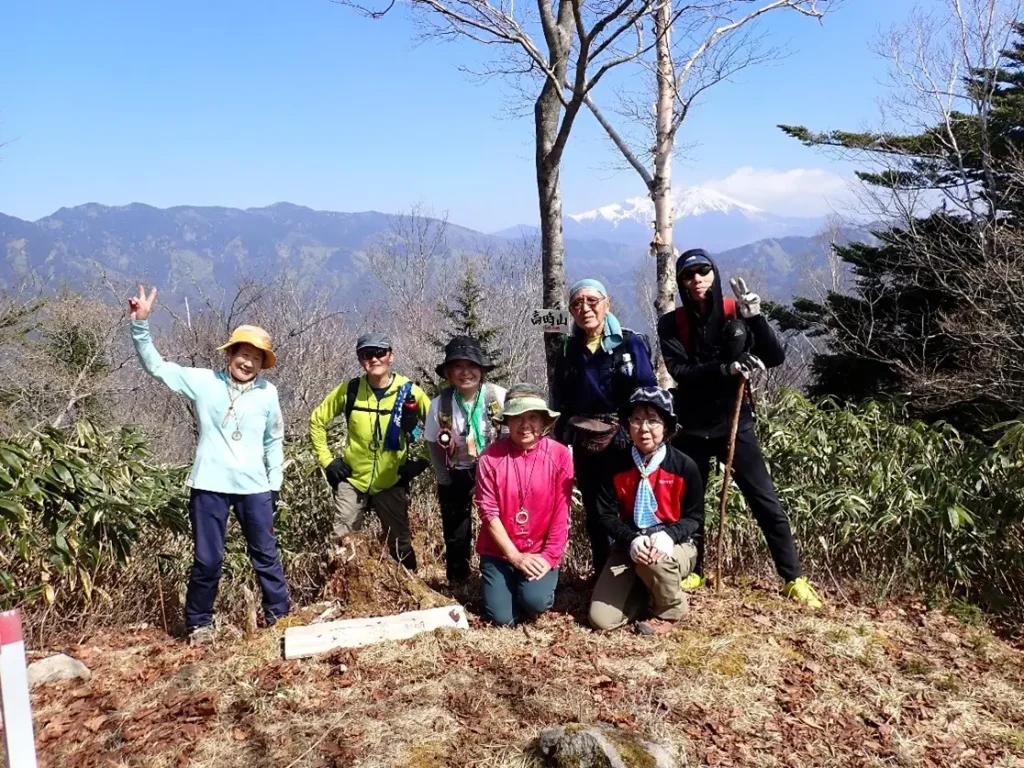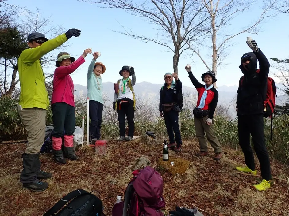 折しもこの日はIM君が高時山をもって当会指定の「美濃百山」A、B、C級完登であった。IM君には来年1月の総会にて金、銀、銅の3個のバッジが進呈され表彰される。山頂でささやかだが担ぎ上げたシャンパンで彼の完登を祝福した。