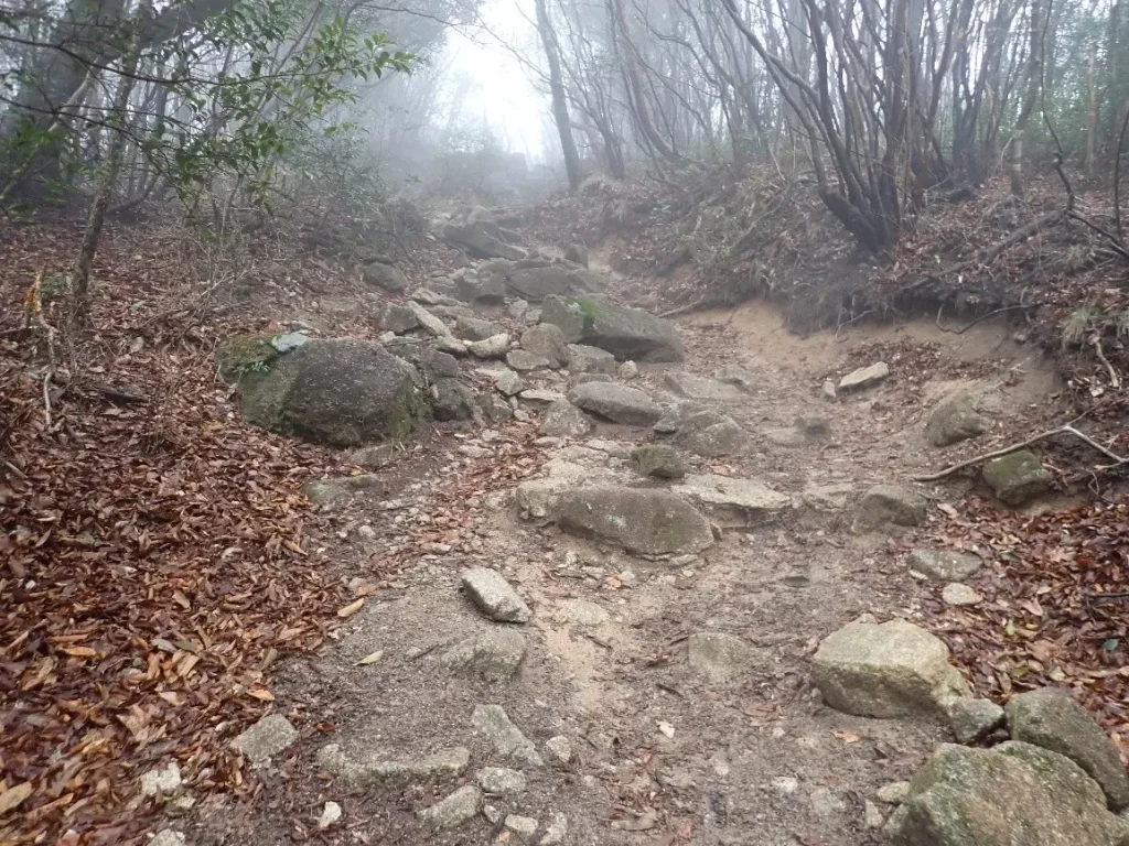 やがて三郡山方面から下りて来る人達とすれ違う。トレランの練習場として利用している方が多いようで雨で洗われた石が多く残された道を宝満山方面へ駆け下って行った。