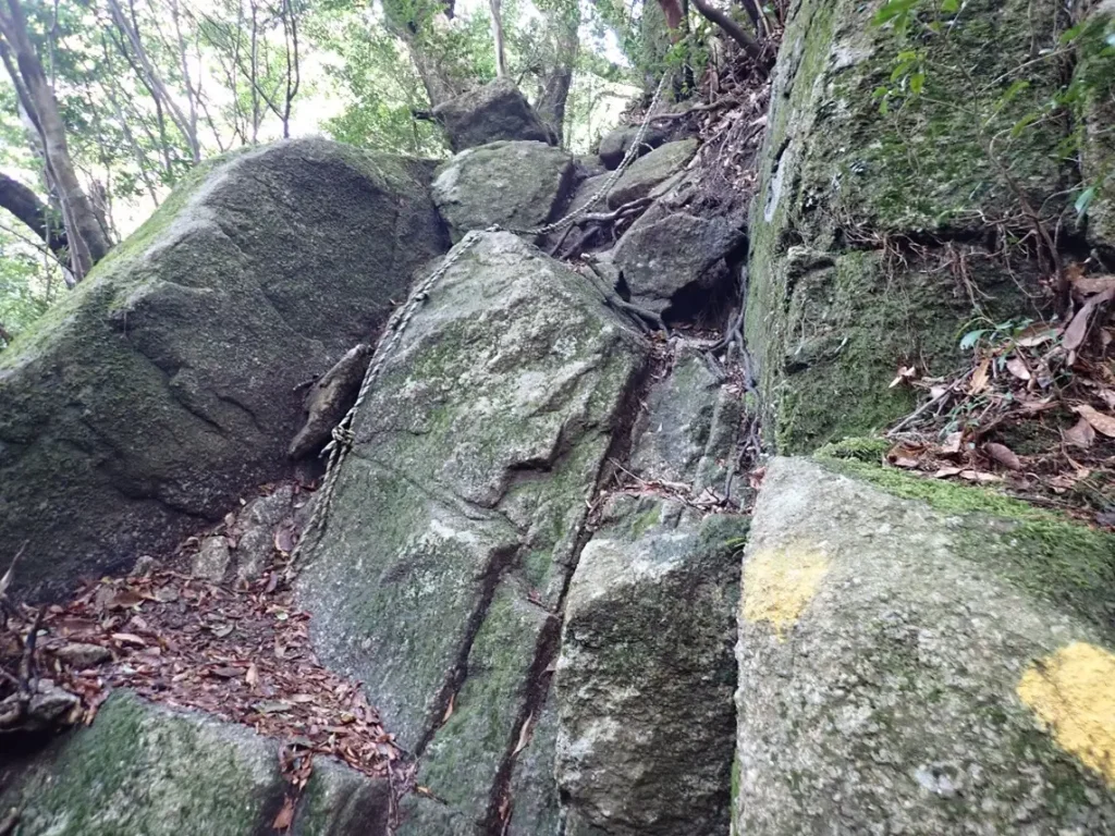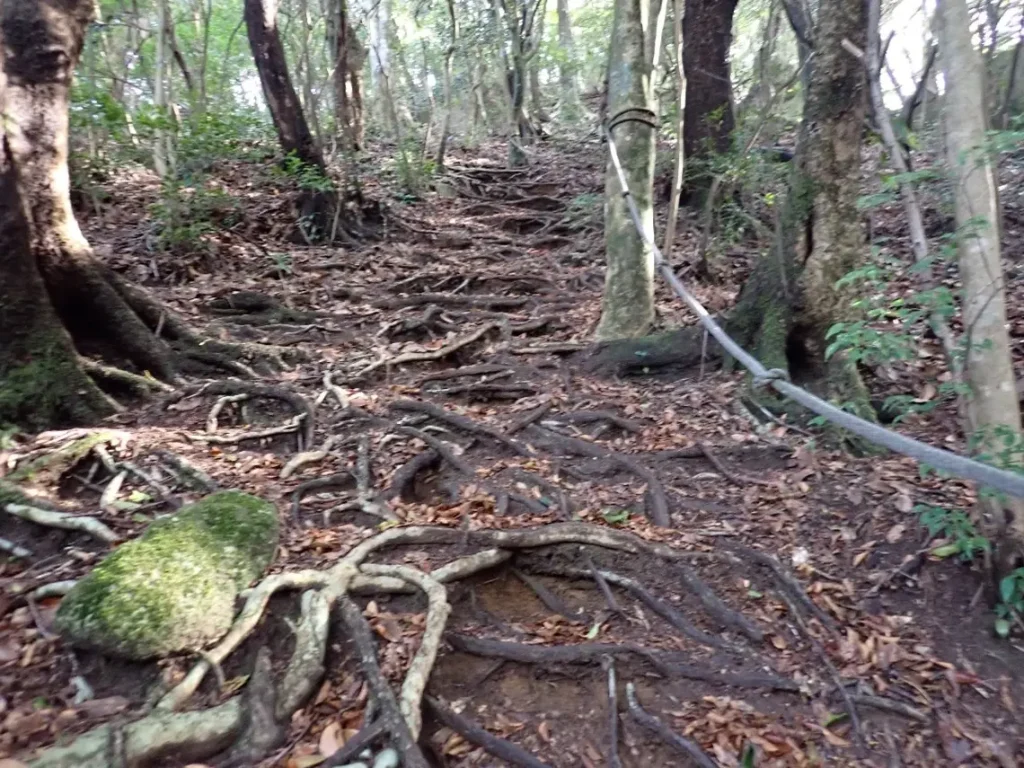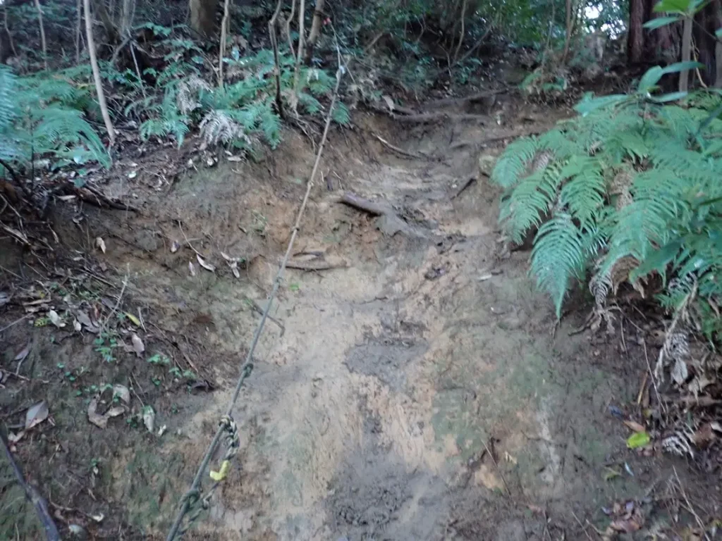 岩は続かず急傾斜地に階段状の木の根が上へ導いた。雨上がり後の下山に使っていたら滑りやすく「おっかなびっくり」フィックスに助けられ「そろそろ下り」になっただろう。
