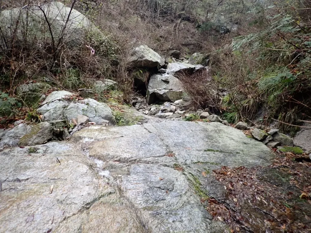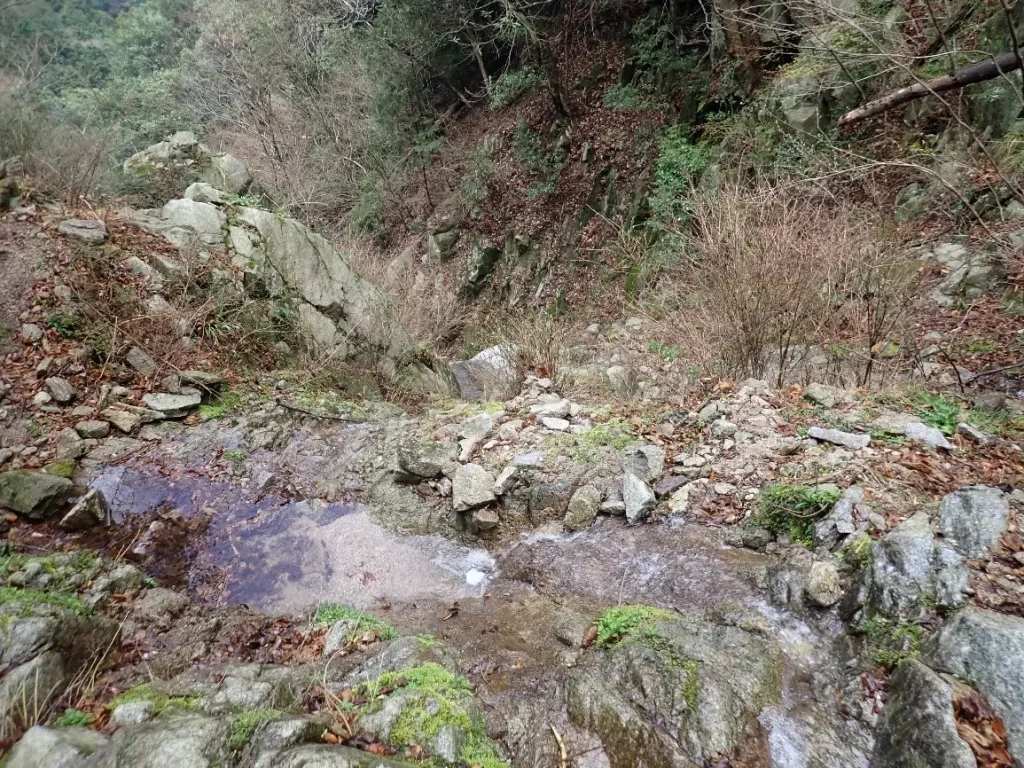滝上部を横断後は谷を右に見て左岸を下る、赤目印が残されルートを外す心配は全く無かった。花崗岩の谷は滝が連続しており下降路は荒れて全く気は抜けなかった。