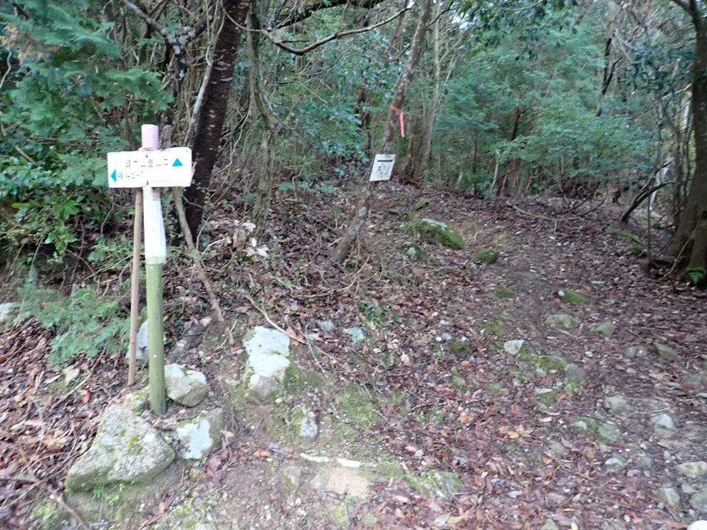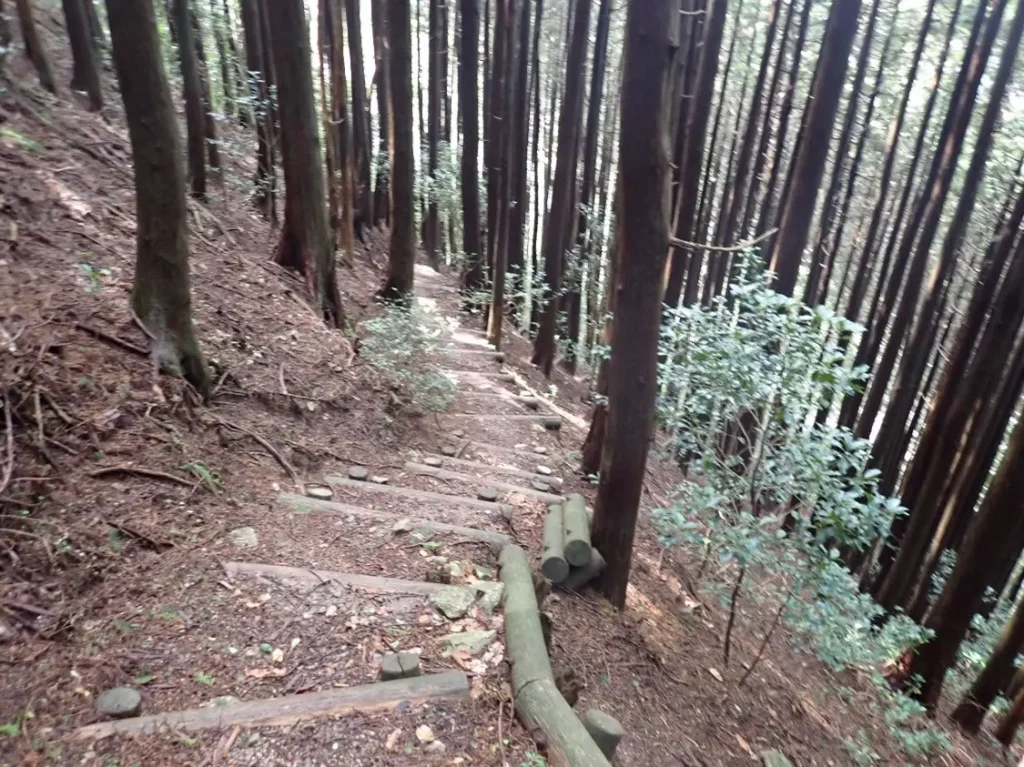 三郡山から砥石山へ至る稜線を欅谷(つきたに)降り口まで400mを辿る間に2名のトレランナーに会った。格好の練習場なのだろう。峠から欅谷へ向かう急な木階段に掛かるとパタッと人の気配が消えた。気掛かりは欅谷は廃道状態との注意書き看板が有ったことだ。