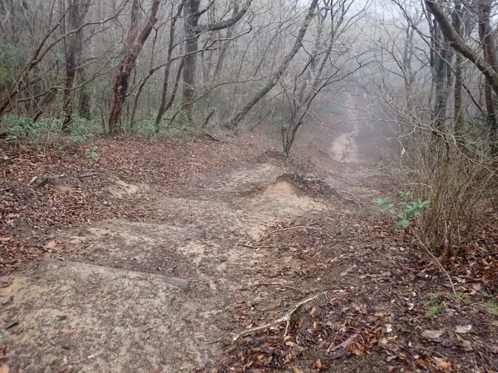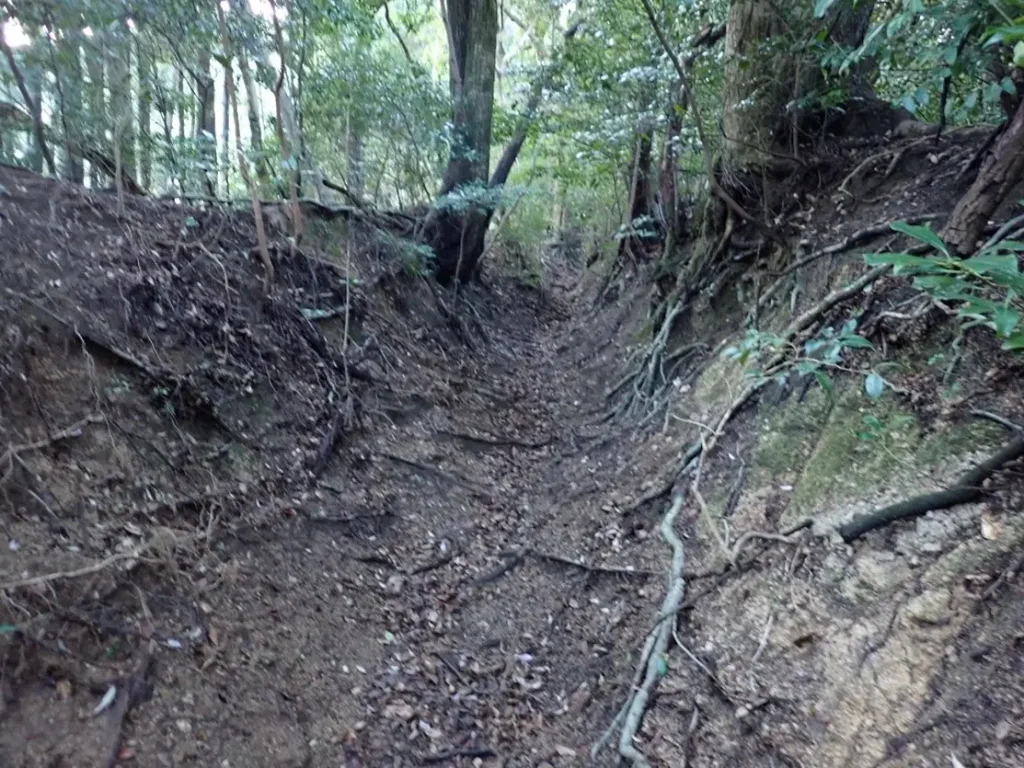 雨上がりの水分を多く含んだ深く窪んだ道はカシやツバキ、ヒサカキ類の照葉樹林が覆って陽を隠し昼なお暗く気分をも暗くさせた。
