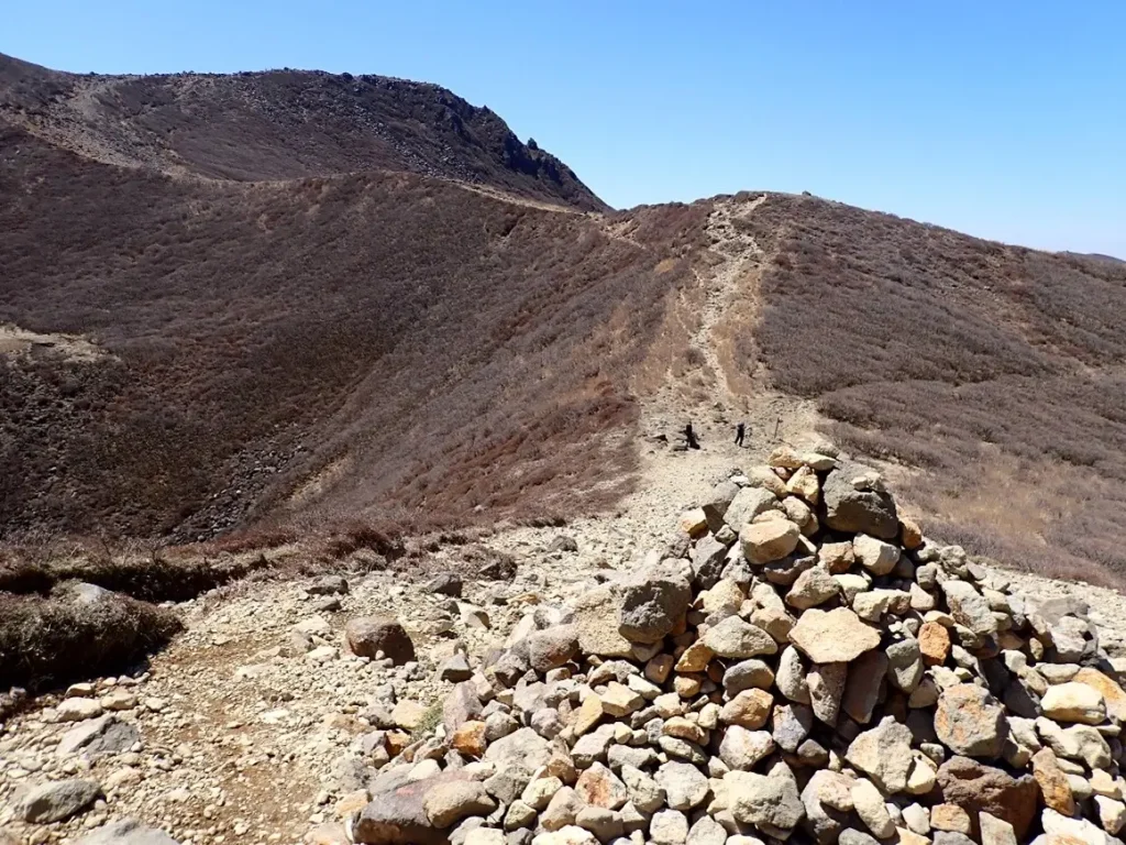 帰りの久住山への道である。積まれたケルンの石の形状を見ると丸い石ばかり、浮石だらけの登山道が想像できよう。