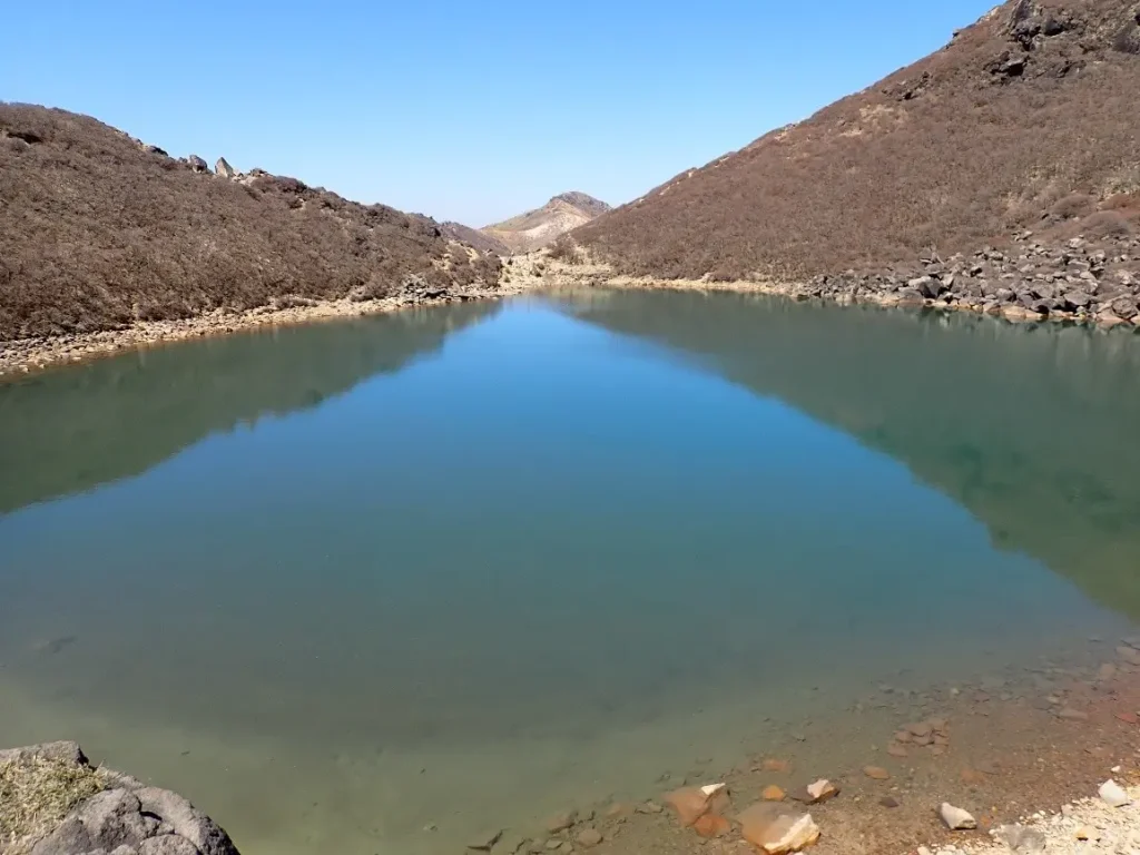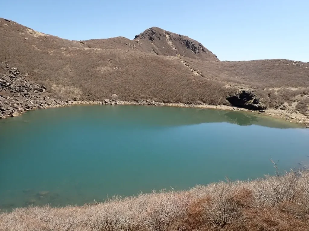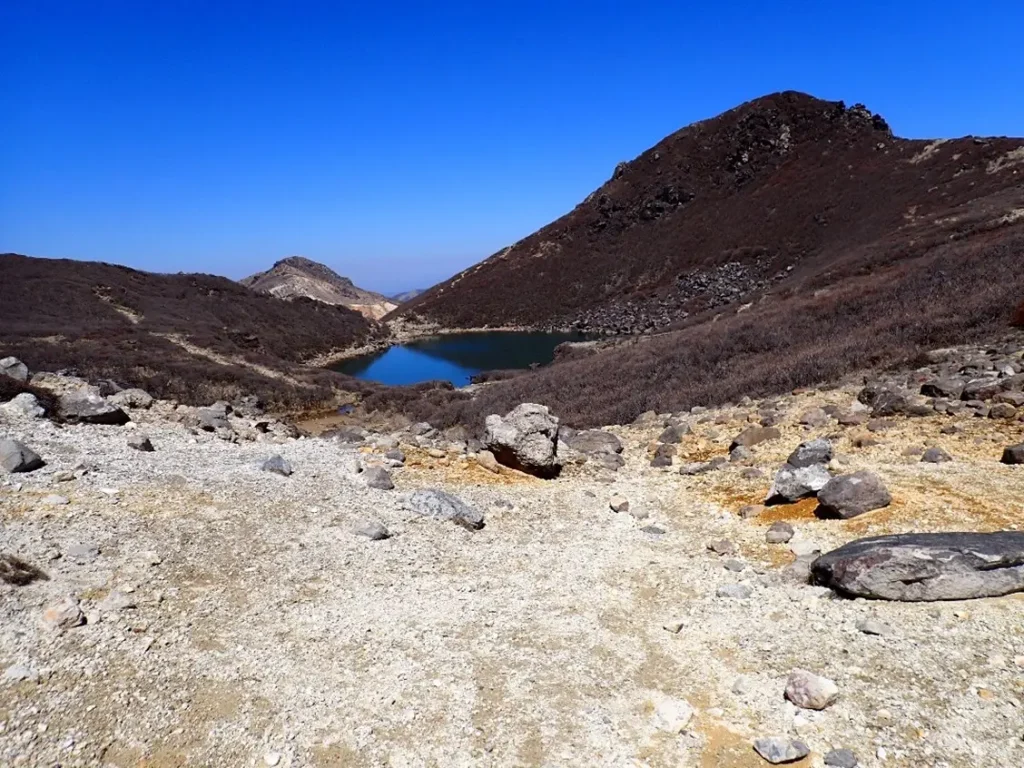 避難小屋から北へ浮石の多い道を天狗ヶ城と中岳のコルを目指し御池を横目に通過した。池には帰りに寄る、青く周りの景色を映す池奥は星生山、右の高みが天狗ヶ城である。