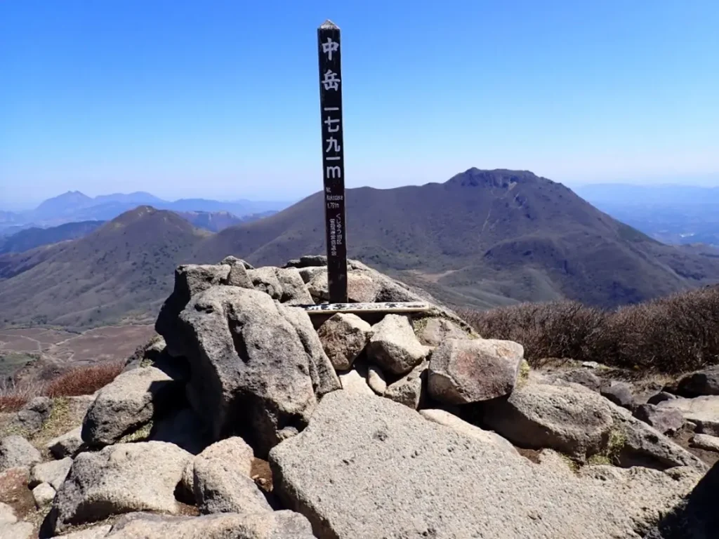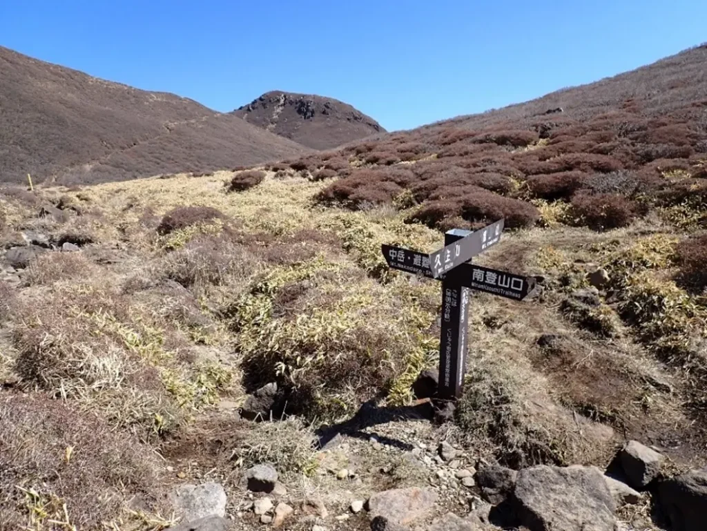 久住山より急傾斜地を東へ高度で約100m、礫岩の浮石だらけの道を下ると途端に人が途絶えた。久住山、中岳、稲星山、南登山口の岐路に神明水分岐の道標が有った。当初は子供時代に登ったと思われる南登山道を下山路にして周回する予定であった。が「車の施錠」に確信が持てなくて往路を引き返すことにしていた。奥に見えるのは最高峰の中岳1791m。