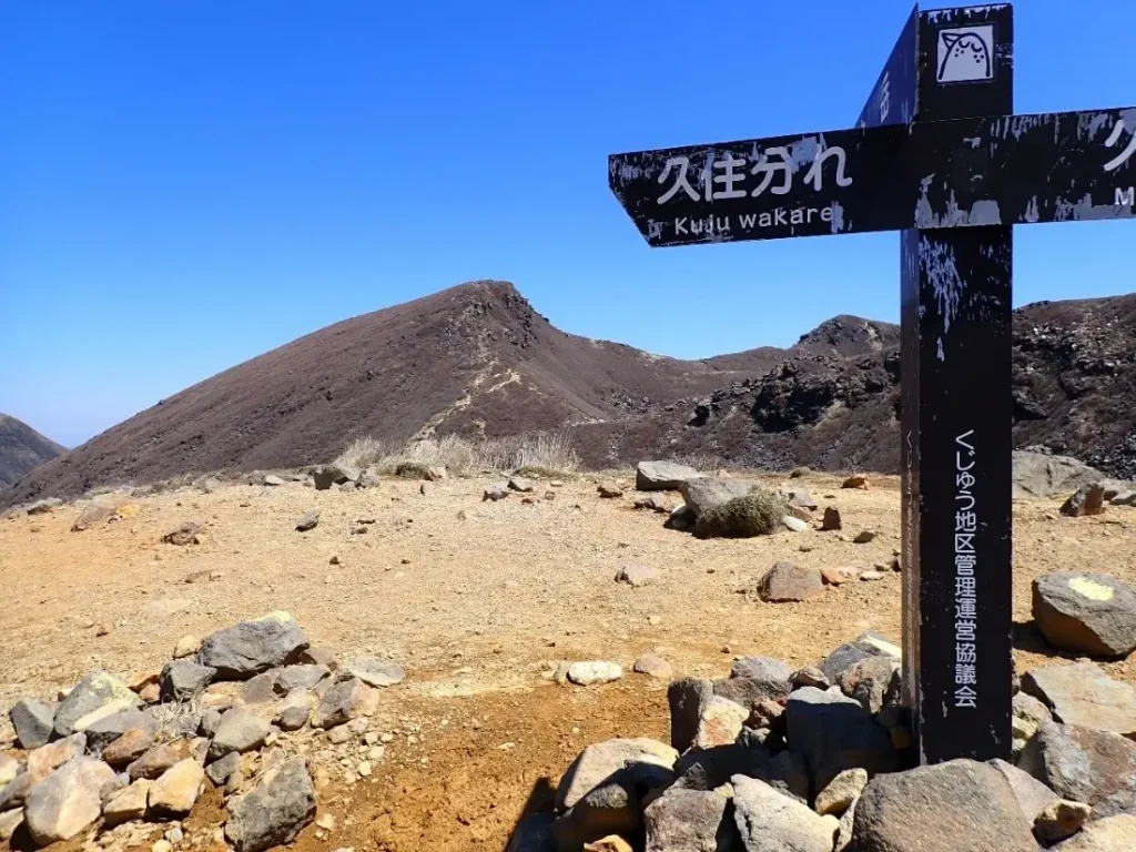 「久住分れ」の分岐道標。大半の登山者は久住山、中岳を往復し此処から「九住分れ」を経由して牧ノ戸登山口へ下りて行く、久住山頂でモデルを勤めてくれた外人女性は御池で私を抜くと此処から「九重分れ」へ下って行った。