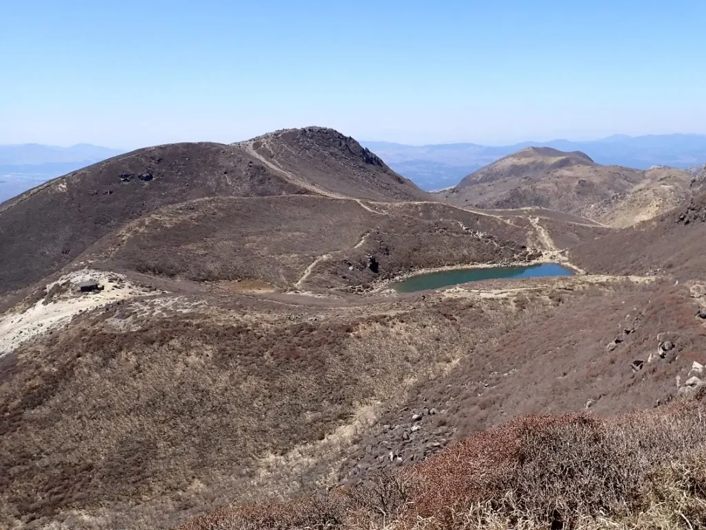 中岳から下山し御池を南から半周し久住山へ引き返す。子供の頃の集団登山では全く予備知識が無く突然の青い池の出現に感動、畔で記念に皆でケルンを積んだのを覚えている。