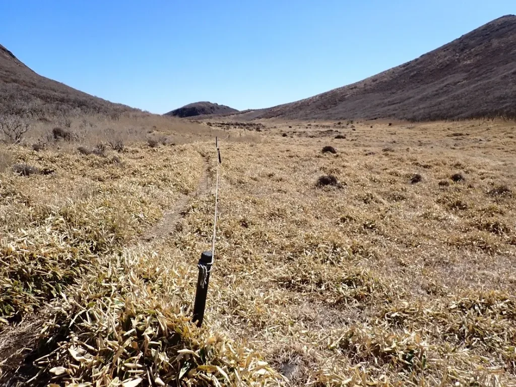東千里ヶ浜と奥に見えるのは白口岳1720mと思われる。この草原を北にひたすら詰めて白口岳の麓から谷沿いの道を北に下れば法華院温泉と坊ガツルである。