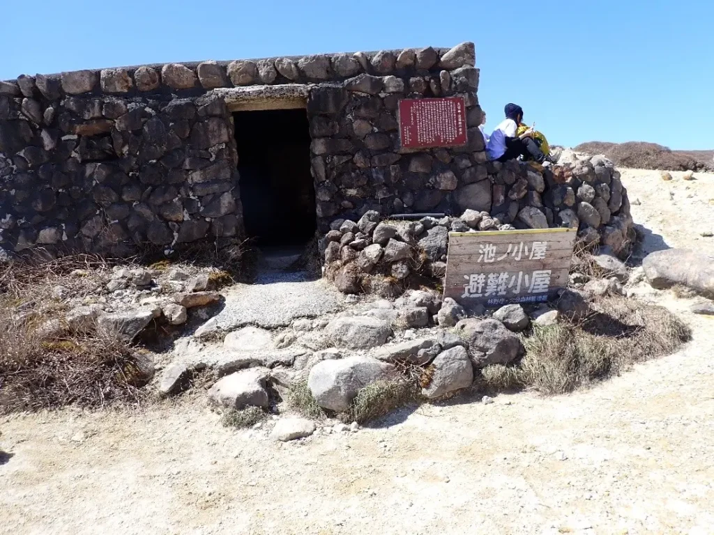 東千里ヶ浜から中岳を目指し70m斜上して高度を稼ぐと御池の避難小屋が有った。東千里ヶ浜では1人会っただけだったが此処から人が多くなって百名山で有ることを実感した。