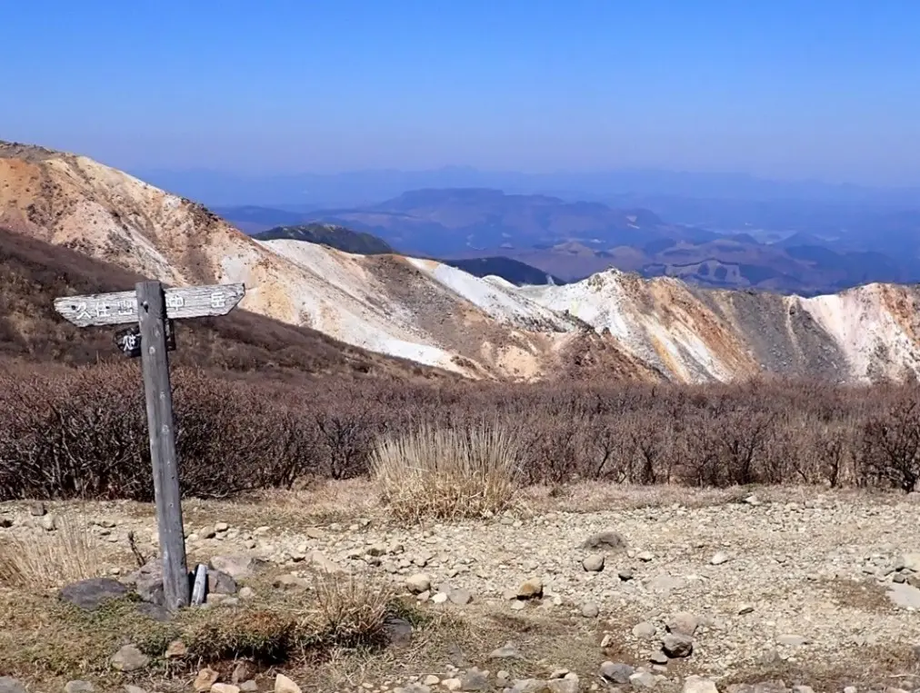 振り返ると久住山と御池、その奥は星生山1762mである。久住への帰りの登山道が明瞭に白く導いている。火山特有の礫岩の浮石だらけで避けて歩くのに疲れるのだ。
