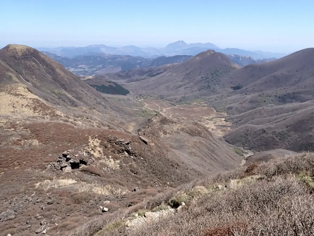 中岳山頂から坊ガツル(中央の平原)を見下ろした。左が三俣山東峰1743m、坊ガツル奥は平治岳、最奥に霞んでいるのは由布岳と思われる。法華院温泉は山蔭で見えない。